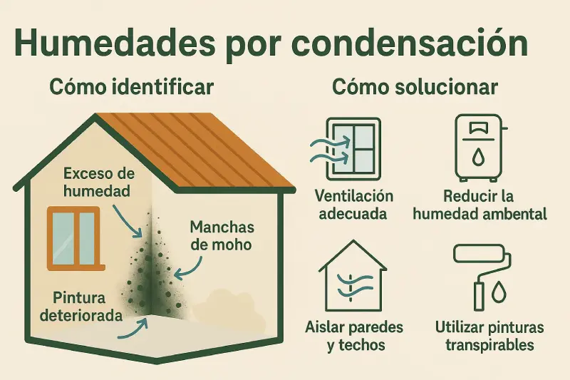 - Aislamiento térmico deficiente: Provoca superficies interiores frías donde se condensa el vapor.